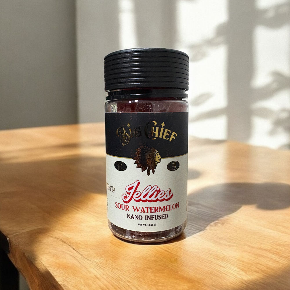 Pucker up for power with Big Chief Jellies Sour Watermelon Gummies, infused with nano D9 + THCp for lightning-fast, full-spectrum effects. Each gummy bursts with tangy watermelon flavor and serious potency, packing a total of 15,000mg per jar. Smooth, sour, and strong, these jellies deliver a head-to-toe high that hits quick and lasts long — made for seasoned consumers who like it bold.