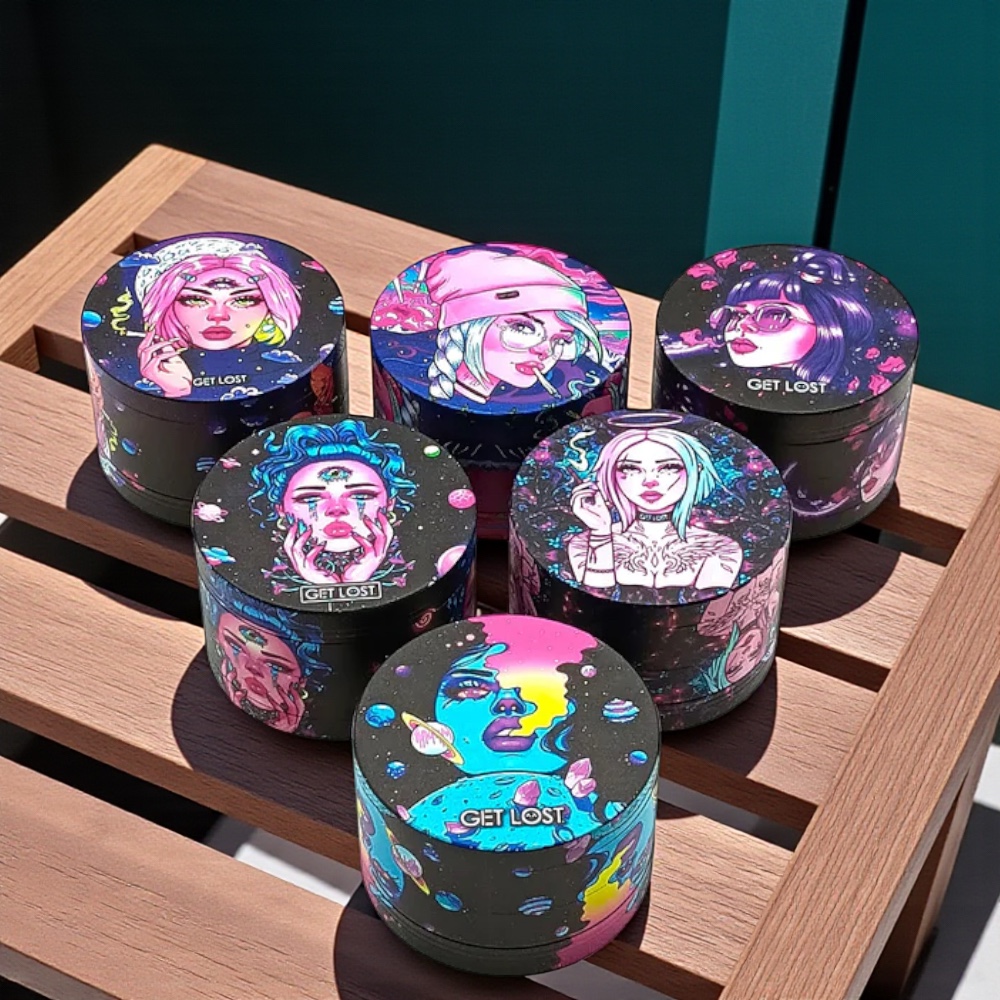 Grind in cosmic style with the Get Lost Galaxy Herb Grinder. Measuring 63mm, this four-piece aluminum grinder features razor-sharp teeth for a smooth, consistent grind every time. Its shimmering galaxy finish and magnetic lid make it as functional as it is eye-catching — built to last and made to shine.