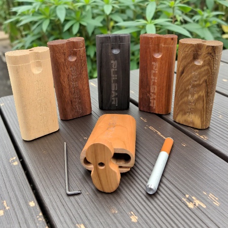 Features: Handcrafted wooden body • Built-in herb storage • Spring-loaded one-hitter included • Compact and travel-ready design